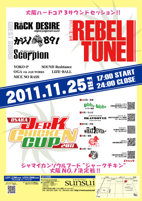 2011.11.25(fri) -SOUND NITE-REBEL TUNE / OSAKA JERK CHICKEN CUP 2011 ■ MAIN FLOOR ROCK DESIRE CASINO 891 Scorpion The Silent Killer OGA rep JAH WORKS YOKO-P feat.HOT HEAD from BASS MASTER SOUND RESISTANCE LIZE BALL ■ LOUNGE FLOOR NICE NO RASS ■ ENTRY SHOP ( AtoZ ) LABBALABBA食堂 ( 北大阪・高槻 ) SKAVOOVIE ( なんば・大阪 ) WHAT EVER ( 東大阪・布施 ) 登り鯛 ( 大阪・福島 ) 祭屋 ( 大阪・相川 ) ■OPEN 17:00 - CLOSE 24:00( 結果発表 23:30 ) ■前売 \23