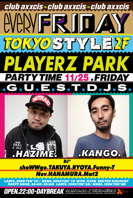 管理人様告知失礼します。 本日11/25(金)に毎週金曜日開催のBIG PARTY「TOKYO STYLE 」が開催されます。 GUEST DJは2FにはDJ HAZIME,DJ KANGO、3FにはDJ TATSU,DJ BOBBYを迎え、いっそうの盛り上がりを見せること間違いなしです!!! エントランスにてタケのゲストで「コウ」と言って頂ければ何名でも格安なゲスト料金でご入場できますのでご利用ください♪ ★☆★☆ゲスト料金★☆★☆ 22時〜25時:男性1000円/0D、女性1000円/2D 25時以降に入場:男女1500円/1D ★☆★☆★☆★☆★☆★☆★ 22時〜25時は生ビール、カクテ