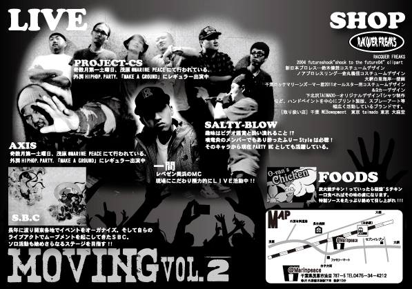 MOVING.VOL2 @茂原MARINPEACE HIPHOP.PARTY DJ.MIX-PLAY&LIVE.DANCE.SHOW 珍しいメンツのLINK.間違いない音が、そこにある。 すべてのBlack.Musicファンに捧げる一夜! 2011.11.26(sat) OPEN.23:00〜 ADM.1000/1D DJ ・SHAKU ((RACQUER.FREAKS)) ・KAZZY ((TEMPTATION)) ・10-HALF ((TIPSY)) ・RYO-tang ・SHIGE ・Hisa ((CLUTCH)) Live ・PROJECT-CS ・S.B.C ((G.O.D)) ・SALTY-BLOW ((噴流炎)) ・一間 ・AXIS DANCE ・KATSU&MASA. ((K.D.S))