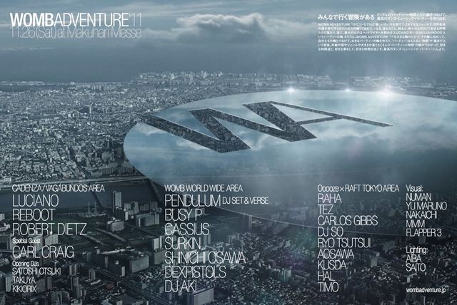 開催まで、あと5日!! 前売りチケットご購入はお早めに! 今年も冬の大型フェスティバル、WOMB ADVENTURE’11が、 11月26日(土)幕張メッセにて開催決定!! みんなで行く冒険がある。 たくさんの'パーティ=仲間たち'の輪をつなげて、最高のダンス・ミュージック・パーティを作り出す。WOMB ADVENTURE '11、11月26日(土)に幕張メッセにて開催!! VAGABUNDOSとは? 1970年代のヒッピー・ムーヴメントや1980年代末のセカンド・サマー・オブ・ラヴといったダンス・ミュージック / レイヴ・カルチャーの系譜を正統に引き継ぎなが