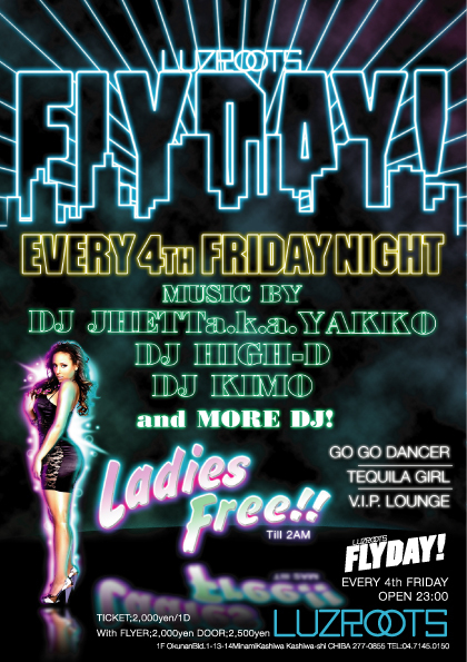 ■EVENT名 『 FLYDAU! 』 LUZROOTSが毎月第四金曜日にお送りする『LUZROOTS FLYDAY』!!!!!! 女性のお客様は2時までにご入場いただくと、何とエントランスフリー!! 毎月第四金曜日、最新のHIPHOPを中心にDJのみでお送りするNEW PARTY『LUZROOTS FLYDAY』毎月RESIDENT DJとしてJHETT a.k.a YAKKO&DJ HIGH-Dの二人が登場!周りを固めるDJ陣もPARTYというPARTYを体感してきたスキル、経験共に申し分のない実力者揃い!さらにLUZROOTS FLYDAYオリジナルのVIPシートも登場!昨今のLIVEありきなPARTYが混在する柏の風潮に風穴をあけるべく始動した、
