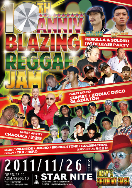管理人様告知失礼します。 BLAZING REGGAE JAM -10th ANNIVERSARY- SOLDIER&HIBIKILLA [W] RELEASE PARTY&DIZZY'S BIRTHDAY BASH 2011.11.26 [SAT] @CHIBA STARNITE OPEN/23:00 ADM/\2500w1D with FLYER/\2000w1D ※12時までに入場の女性はENTRANCE FREE!!! -GUEST ARTIST- ・SOLDIER ・HIBIKILLA ・笑連隊 ・CHAQURA -GUEST SOUND- ・SUNSET the platinum sound ・ZODIAC DISCO ・GLADIATOR -SOUND- WILD SIDE / JUICHO / BIG ONE STONE / GOLDEN CHIME / AYAME -DEEJAY- TKR / HERO -FOO