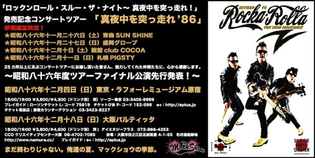 「ロカ・ローラ・ゼロ」大好評爆走中のマックショウ、ツアー再・再延長決定! 昭和八十六年十一月二十六日(土)青森SUN SHINE 19:00/19:30 ¥3,800/¥4,200(ドリンク別) 問) GIP 022-222-9999 サンシャイン 017-729-4010 プレイガイド : ローソンチケットL-コード 23983 チケットぴあ P-コード154-495 e+:http://eplus.jp