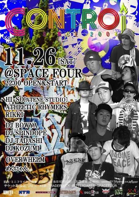 先月7周年を迎えたばかりのコントロールですが、8周年に突入しても休まず開催致します!! GOOD MUSICに体を揺らしに来て下さい☆ 皆様のお越しをお待ちしております! チケット希望の方はメッセージもしくはコメント下さい!! 毎月第四土曜日開催CONTROL ■CONTROL!!!!!!!!!! 2011/11/26(Sat) @青森SPACE FOUR http://prod.p1.bindsite.jp/spacefour/index.html 22:00 OPEN&START!!!! ■DJ BOWYA SPINDOPE TADASHI KOZUMI ■SOUND OVER WHELM ■LIVE HI-SO [ATENESTUDIO] ATHLETIC RHYMERS RIKKI