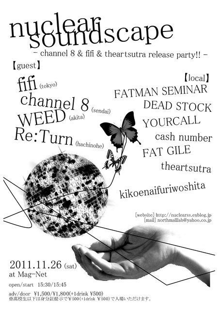 今年3度目のnuclear soundscapeを本日開催いたします。今回はchannel 8、fifi、theartsutraのトリプルレコ発です。全11バンド、2ステージ制でのライブ。まだ悩んでる方は是非! nuclear soundscape vol.7 -channel 8 & fifi & theartsutra release party!!- ■2011.11.26(sat) ■@ Mag-Net (青森県弘前市元寺町35 オリオンビル2F) ■open/start 15:30/15:45 ■adv/door ¥1,500/¥1,800 (+1drink ¥500) ※高校生以下は身分証提示で¥500(+1drink ¥500)で入場いただけます。 ■live artists & time table 15:30
