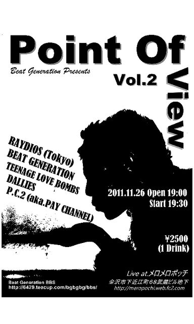 Point Of View Vol.2 @メロメロポッチ(金沢) 石川県金沢市下近江町68武蔵ビル地下 2011.11.26 Open19:00/Start19:30 2500yen(1Drink) Beat Generation Dallies P.C.2(aka.Pay Channel) The Raydios Teenage Love Bombs