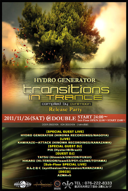 >■【HYDRO GENERATOR "V.A. /Transitions in Trance" Release Party】■ □WHEN:2011/11/26〔SAT〕 □WHERE:金沢DOUBLE □TIME:OPEN22:00〜START23:00〜 □TICKET:DOOR3500YEN ADV3000YEN