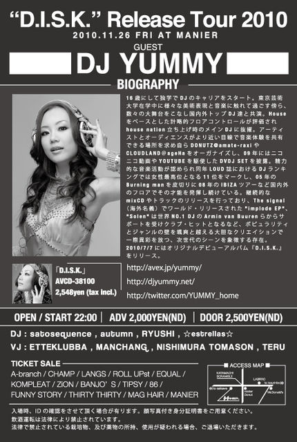 2010 / 11 / 26 (金) タイトル : DJ YUMMY "D.I.S.K" RELEASE TOUR ジャンル : HOUSE / TECHNO ■OPEN 22:00 ■ADV/¥2,000 ■DOOR/¥2,500 ■GUEST DJ : DJ YUMMY ■DJ : satosequence / autumn / RYUSHI / ☆estrellas☆ ■VJ : ETTKLUBBA / MANCHANG / NISHIMURA TOMASON / TERU INFO : MANIER 076-263-3913 DJ YUMMY(ヤミー) 現場主義のhouse style DJ。16歳にして独学でDJのキャリアをスタート。東京芸術大学在学中に世界的なDJオーディションで才能を認められた事をきっかけに注目を浴び、 Louie Vega, Kerri ChandlerからDav