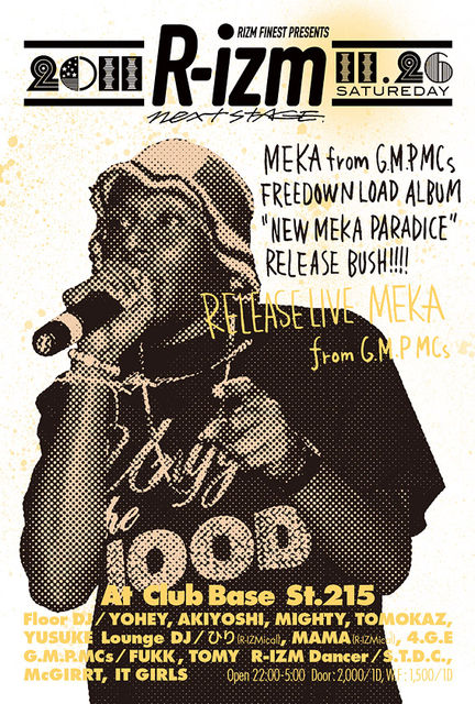管理人様告知失礼致します. メッセージを送るか又は当日エントランスでDJ MIGHTY(マイティー)のゲストでとお伝え頂ければ1500/1Dで入れますので是非ご活用下さい! 以下詳細になります。 【R-IZM】vol.104 Blazin HipHop,R&B,Reggae and Good Dance Music!!! MEKA from.G.M.P.MCs, 孔雀 Download Album "NEW MEKA PARADICE" Release Bush!!!!! -Date- 2011.11.26.Sat -Venue- 浦和Club Base St.215 -Open- 22:00-5:00 -Charge- Door:\2,000+1D W/F:\1,500+1D -Release Special Live- MEKA from.G.M.P.M