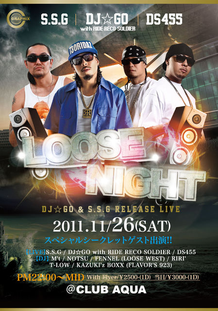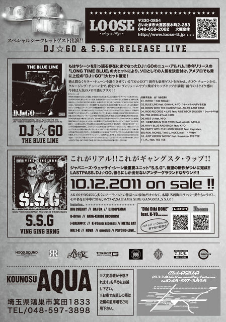 管理人様、告知失礼致します。 LOOSE NIGHT presents... DJ☆GO & S.S.G Release Live!!!!!! 全国にその人気を知らしめた埼玉を代表するイベント「LOOSE NIGHT」のメインアクトである "DJ☆GO"と"S.S.G"のダブルでのリリースライブが決定!! ウェッサイシーンを牽引するフッドサウンドの代表"DS455"をも迎えた豪華な1夜!! さらにこのメンツならではのシークレットゲストも多数参加...圧巻のスペシャルライブを見逃すな!!! 11/26(SAT) 鴻巣@CLUB AQUA PM22:00〜MID W/F/¥2500ー(1D) ※エントランスにてフライヤーを出し