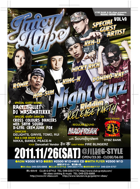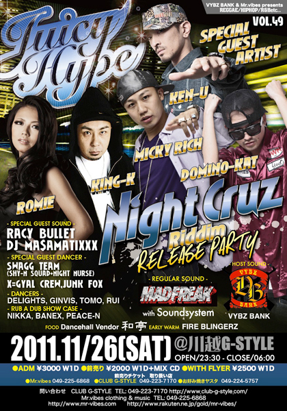 【JUICY HYPE vol.49 〜NIGHT CRUZ RIDDIM リリースパーティー〜】 JUICY HYPE vol.49 2011 11/26(Sat) @G-STYLE (埼玉県川越市) - SPECIAL GUEST ARTIST - KEN-U MICKY RICH DOMINO-KAT KING-K ROMIE NOB-SUN - SPECIAL GUEST SOUND - RACY BULLET DJ MASAMATIXXX -SPECIAL GUEST DANCER- CROSS COLOURS DANCERS with SHYN SQUAD X=GYAL CREW JUNK FOX -REGULAR SOUND- MAD FREAK with soundsystem -DANCERS- DELIGHTS GINVIS TOMO RUI - RUB A DUB SHOW CA