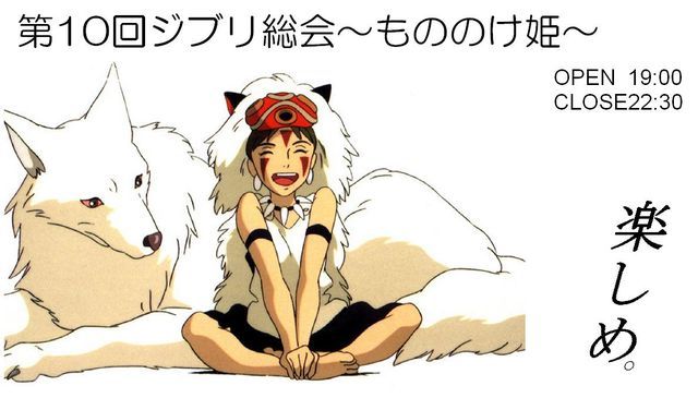 前回は40名以上の方達に来て頂いて、梅雨のジメジメした空気を吹き飛ばすくらい ジブリトークで楽しい時間を過ごす事ができました! ●日程・内容 11月26日(土) 19:00〜22:30 1次会 23:00〜翌5:00 2次会(参加自由) ジブリに関する雑談をしたり、グッズや資料を観賞したり、 クイズで盛り上がったり、ジブリが好きな人が集まって 楽しい時間を過ごしてみませんか? 今回のコンセプトは「もののけ姫」です! もののけ姫に関するグッズや資料を持ち寄ったり、クイズ大会をやります! もちろん、もののけ姫に限らずジブリが
