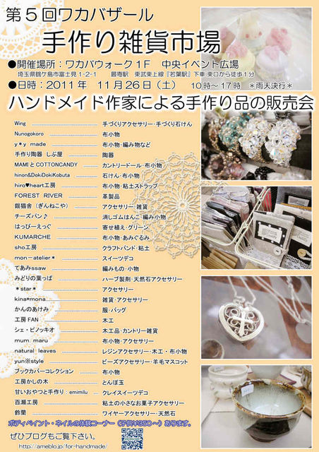 第5回ワカバザール 手作り雑貨市場 開催のお知らせ 秋も深まる、今日このごろ。 大きなX’masツリーのある雑貨市場に出かけてみませんか? (^−^)きっと、素敵なお気に入りが見つかるはず...。 ●日時:11月26日(土)10時〜17時(一部19時まで) ●場所:ワカバウォーク1F 中央イベント広場 http://www.wakaba-walk.com/ 埼玉県鶴ケ島市富士見1丁目 最寄駅 東武東上線『若葉駅』下車 徒歩1分 ●出店予定:約30ブース ●ブログ http://ameblo.jp/for-handmade 今回は、ネイル体験コーナーがあります。