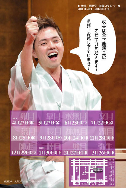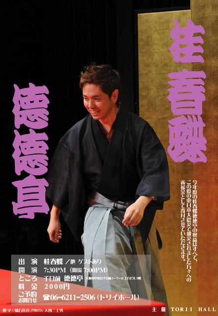 はじめまして 上方落語、とくに桂春蝶さんのファンです 大阪在住の菜の花と申します 寄席のご案内をさせてください *********************************************************** 11月28日(月) 「桂春蝶 徳徳亭」 会場:大阪市中央区 上方ビル3階 「鯨料理 徳家」 開演:19時半 出演:桂春蝶 /特別ゲストあり 料金:2,000円 お問い合わせ:06(6211)2506 TORII HALL 収益のすべてを、東日本大震災で被