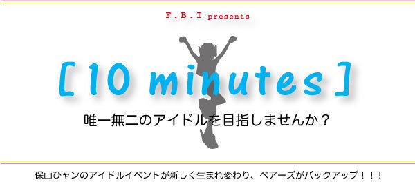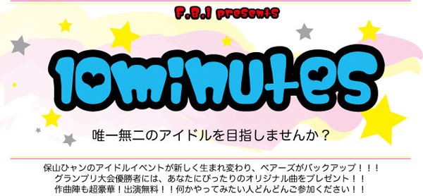 投票で優勝者が決まる全員参加型アイドル発掘プロジェクト F.B.I presents【10 minutes】season2 (FBIはファインディング・ベアーズ・アイドルの頭文字です。) http://home.att.ne.jp/orange/bears/FBI.html 〔10minutes blog〕http://ameblo.jp/fbidol/ 告知や、イベントの様子などお届け http://twitter.com/fbidol10minutes(@fbidol10minutes) ≪ USTream 中継 ≫spoon+ aco( #fbidol live at http://ustre.am/snKX) #UPPT http://www.ustream.tv/channel/fbidol10minutes F.