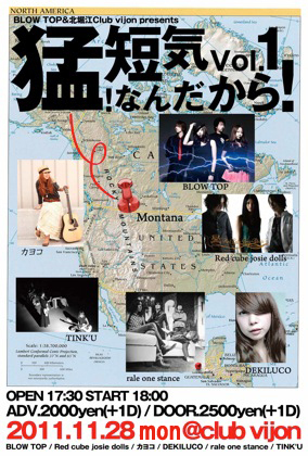 BLOW TOP&北堀江Club vijon presents 「猛!短気なんだから!Vol.1」 場所:北堀江club vjon 時間:OPEN17:30 / START18:00〜 料金:前売¥2,000/当日¥2,500 (D別途¥500) ACT:BLOW TOP / DEKILUCO / rale one stance / Red cube josie dolls / TINK'U / カヨコ *BLOW TOPから重大発表あり、お楽しみに! ※新グッズ販売開始(タオル¥1500) ----------------------------------------- 北堀江Club vijon 大阪府大阪市西区北堀江1-22マインズ北堀江B1 http://vijon.jp/index.html <アクセス> 地下鉄長堀