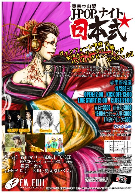 山梨⇔東京J-POPナイト日本式 GUESTにCLIFF EDGEと過激なPVでいま話題のsoweluを迎えてのJ-POPクラブタイム!! 大注目のイベントが山梨に上陸、盛り上がること間違いなし! ヴァンフォーレ甲府 vs 水戸ホーリーホック戦パブリックビューイングスペシャル!! ヴァンフォーレの試合を地元甲府桜座からみんなで応援しよう 公認応援ソングを歌うJINCOも参戦! @甲府桜座 http://www.sakuraza.jp/index.htm 11/28(日) OPEN:12:00 KICK OFF:13:00 LIVE START:15:00 CLOSE:21:00 LIVE