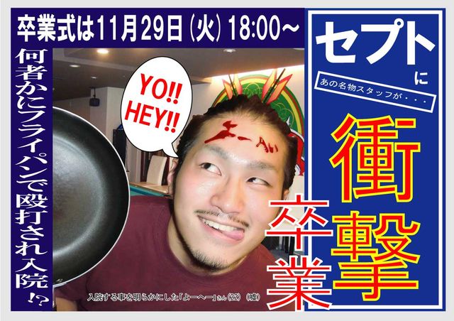 コミュに参加して頂いてる皆さん、こんにちは すっかり季節は秋から冬へ・・・ 寒過ぎて管理人もとうとう今季初ダウンデビューしてしまいました 最近スタッフの間でも風邪が流行っているので、皆さんも気を付けて下さいね 話は変わりまして、今回は寂しいお知らせです・・・。 セプトのキッチンで料理を作ってくれてた「よーへー」が卒業する事になりました・・・ 卒業して、立派な社会人になれる様に、卒業式をしたいと思います 皆さんも「よーへー」の門出を一緒に見届けて