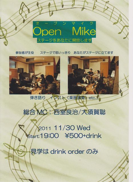 30日(水) ムロジ/gasuo企画 オープンマイク 総合進行;西室良治/大須賀聡 Open/Start;19:00 ¥500+drink(見学drinkのみ)