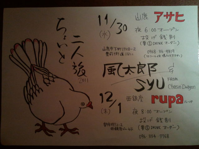 Chasin ' dragon のSYUさんとの投げ銭二人旅! 山鹿に新しくOPEN した「アサヒ」が初日です。 ちょいと二人旅2011。 出演:風太郎/SYU(from:Chasin ' dragon ) 夜6時オープン 投げ銭制(要①ドリンクオーダー) Tel 0968+36+9819(⑩コール位鳴らして下さい!)