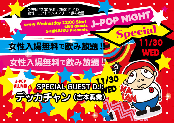 管理人様告知失礼致します。 本日は最終水曜日と言う事で新宿axxcisにてJ-POP NIGHT SPECIALの開催です! SPECIALという事でGUEST DJに吉本興業からデッカちゃん!! そして女性はフリーで終日飲み放題となっております!! ジャンルはJ-POPを基本としたALL MIXスタイル! 店内にはリクエストカードも常設! (時間帯やジャンルにより全てのリクエストには対応できない場合があります) みなさんのご来場お待ちしております! 11/30(WED) J-POP NIGHT SPECIAL OPEN : 22:00〜Midnight 女性 : FREE!! / 終日飲み放題