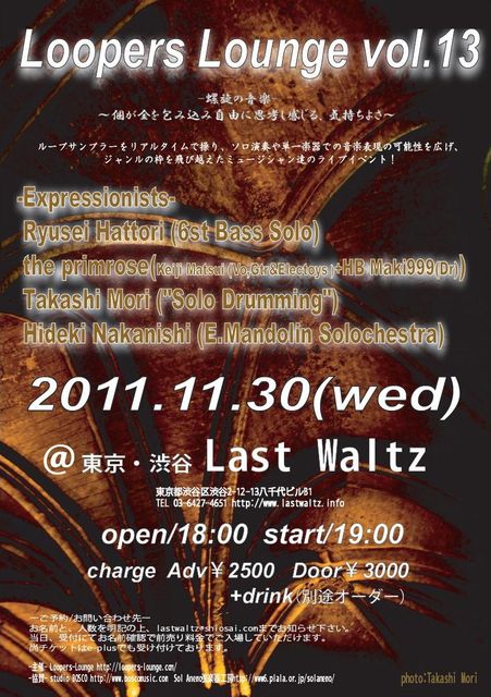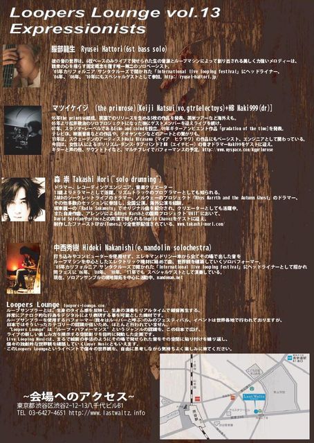 管理人様、 突然に失礼致します。 ルーパーズ・マニア管理人のさかなと申します。 ご紹介したい、ループマシンを使ったプロフェッショナルなイベントがございますので、おじゃまさせてください。 どうぞよろしくお願いいたします。 不適格でしたら削除してください。 失礼いたしました。 11月30日(水) 東京・渋谷Last Waltz http://lastwaltz.info/ Loopers Lounge vol.13 19:00から演奏スタートです。 東京都渋谷区渋谷2−12−13 八千代ビルB1F 03−−6427−