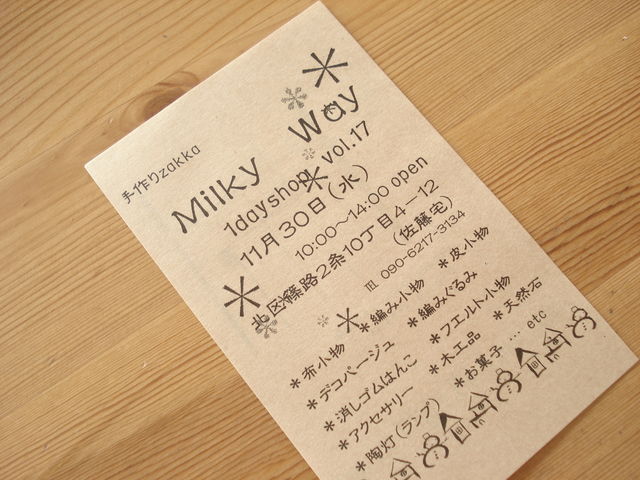 あいの里のお隣、篠路でのワンディショップのお知らせです 手作りZAKKA「Milky Way」VOL.17 11月30日 10時〜14時OPEN 札幌市北区篠路2条10丁目(佐藤宅) 電話090-6217-3134 布小物*編み小物*革小物*デコパージュ*編みぐるみ 消しゴムはんこ*フェルト小物*アクセサリー*木工品*天然石*陶灯(ランプ)*お菓子etc. ちょっと覗いてみたい方もお気軽にどうぞ〜♪