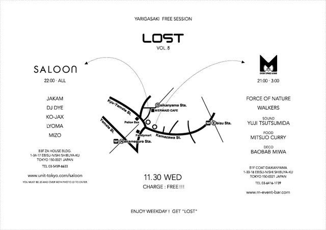 『 LOST vol.8 』 ~ YARIGASAKI FREE SESSION ~ 代官山鎗ヶ崎シーンを盛り上げる行き来自由のフリーパーティー「 LOST vol.8 」! 11/30 (水) @ 代官山 SALOON & Daikanyama M OPEN : daikanyama M : 21:00〜3:00、SALOON : 22:00〜5:00 Fee : ENTRANCE FREE!!! 【SALOON】-22:00-ALL- DJ : JAKAM (Juzu a.k.a. Moochy-NXS / CROSSPOINT) DJ DYE (THA BLUE HERB) KO-JAX (Runch) LYOMA (Abend) MIZO (Waltz) 【daikanyama M】-21:00-3:00- DJ : FORCE OF NATURE (DJ KENT & KZA) WALKERS (Kon / Sin / Kiccio