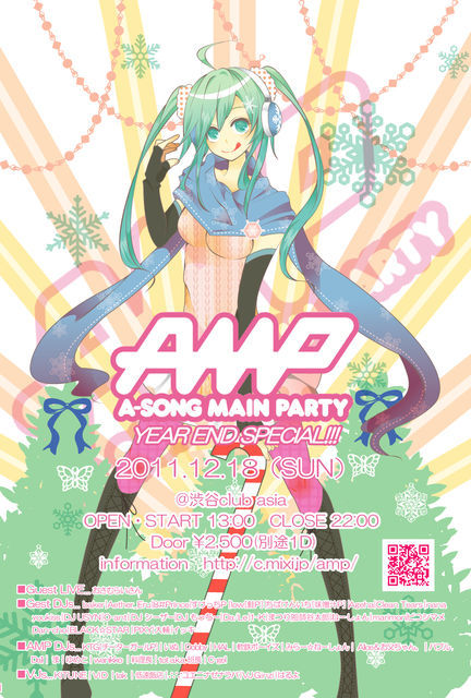 Anime(A-song) Main Party = AMP = 増幅器 皆で楽しんでHAPPYな気持ちを増幅しよう!! 素敵なお客様とDJで作る最高のアニソン(A-SONG) PARTY!!! "AMP" 年末SPECIALなPARTYやっちゃいます! なんと!渋谷club asia 3FLOORで開催です☆ LIVEにDJに踊りあり!! 今年の最後に相応しいSPECIALな内容で盛り上げます! 今回もアニソン、ニコ曲、ボカロ、東方をガンガン流します♪ モチロン、出演・STAFF陣はコスプレで参戦♪ お客様もコスプレ参加しちゃってください! クローク、更衣室もちゃんと用意してあります