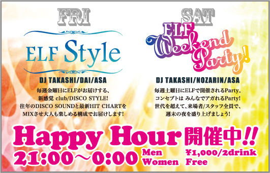 ハートな女性は終日入場料無料で、週末をENJOY!!Lady's Freedom Club ELF: Lady's Freedom ELFでは毎週金曜日Lady's Freedomを開催 女性が自由に楽しめるようにエスコートします テーマは「夏」 ドレスコードも夏っぽく決まってれば女性は終日エントランスFREEです (別途ドリンク代1000円2drinkは発生します) プラス、女性専用ヘアメイクブースを設置してます 専属美容師さんたちがみなさんの髪をアレンジしてくれます 女性だけではなく、もちろん男性の方も大歓迎
