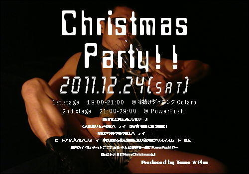 『あなたと共に過ごしたい…』 そんな思いを込めたパーティーが 今宵 姫路で堂々開催! 男だけの男の為の極上パーティー… ヒートアップしたパフォーマー達が 聖なる夜を華麗に彩り 店内はクリスマスムード一色に… 貴方のイヴは きっとここにある… そんな聖夜を一緒にPowerPush!で… 『あなたと共にMerryChristmas☆』 〜Tomo☆plus〜 **ChristmasParty2011@PowerPush!** 2011年12月24日(土) 第一会場 串揚げダイニング Cot