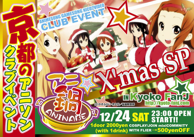 2011年クリスマスイヴ、12月24日(土夜)は・・・ スタジオ並のセット!コスプレ撮影×実力派アニソンDJが本気で混ざり合う! GOTTA煮ジャンルイベント!!! アニ鍋-ANINABE Style.38- -○ァッキん×○ァっきンXXXmasSP- ジングルベールジングルベール ついこないだまで薄着で過ごせたかと思えば、 忘れていたかのように一気に真冬に突入しましたね(´ω`) もういくつ寝るとお正月なんて、んな馬鹿な! ってなレベル