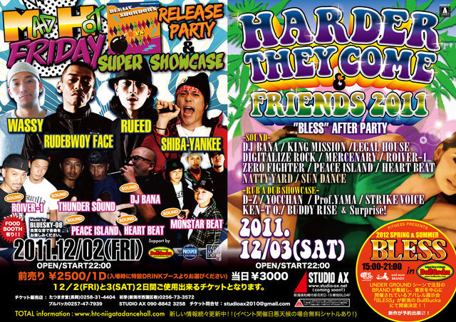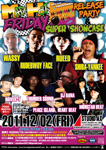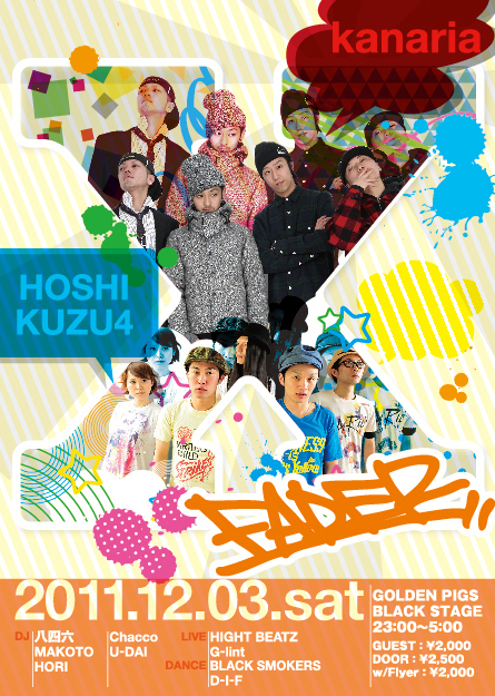12月3日(土) X-FADER@新潟GOLDEN PIGS BLACK STAGE OPEN :23:00 CLOSE:05:00 GUEST :\2000/1D DOOR :\2500/1D w/flyer:\2000/1D 【GUEST LIVE】 kanaria HOSHIKUZU4 【DJ】 八四六 MAKOTO HORI Chacco U-DAI 【LIVE】 G-lint Hightbeatz ON YOUR MARK 【DANCE】 BLACK SMOKERS D-I-F What's "X-FADER"? →その大きさから土地ごとに様々なジャンル・スタイルで発達していった新潟HIPHOPシーン。その新潟各地から『イイものはイイ』の合い言葉のもとに上中下越は勿論、アンダーとオーバー、若手からベテラン、果ては新潟県に収まらず県内外