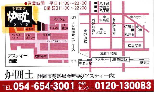 日時:12月29日(木) 19:00〜21:00 場所:JR静岡駅 アスティ西館1F 店名:和菜酒房 『炉囲土(ろいど)』 会費:¥5,000(飲み代込) いちおう14名まで入れる席を押さえてありますが 参加申込者が大幅に増えた場合は 途中で締め切らせてもらいますので 参加希望者はお早めに参加表明して下さい。 尚、参加表明後のキャンセルは2日前までに表明して下さい。 炉囲土の店の様子を知りたい人は下記のアドレスでご覧下さい。 http://www.asty-shizuoka.co.jp/shopguide/shopdetail.cgi?sid=
