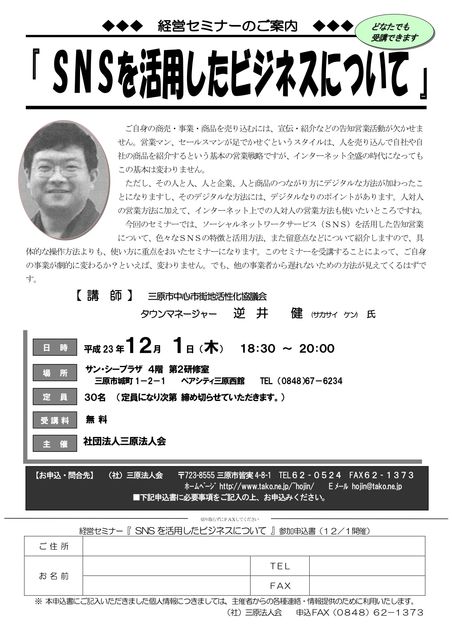 ¡¡»°¸¶Ë¡¿Í²ñÀÄǯÉô¤µ¤ó¤Î¸ø³«¹ÖºÂ¤Ç¡Ø£Ó£Î£Ó¤ò»È¤Ã¤Æ¥Ó¥¸¥Í¥¹¤Î¾ðÊóȯ¿®¡Ù¤È¤¤¤¦¥Æ¡¼¥Þ¤Ç¥»¥ß¥Ê¡¼¤¬³«ºÅ¤µ¤ì¤Þ¤¹¡£ ¡¡»²²ÃÈñ¤Ï̵ÎÁ¡¢ÆÃ¤ËË¡¿Í²ñ¤Î²ñ°÷¤Ç¤Ê¤¯¤Æ¤â»²²Ã²Äǽ¤À¤½¤¦¤Ç¤¹¤Î¤Ç¡¢¶½Ì£¤Î¤¢¤ëÊý¤Ï¤ªµ¤·Ú¤Ë¤É¤¦¤¾¡£ ¡¡¿§¡¹¤Ê£Ó£Î£Ó¤¬¤¢¤ê¤Þ¤¹¤¬¡¢¤ª¶â¤ò¤«¤±¤º¤Ë¡¢¡Øº£¤«¤é»Ï¤á¤ë¿Í¡Ù¤¬¡Ø²¿¤ò¤É¤¦½ñ¤¹þ¤ó¤Ç¤¤¤³¤¦¤«¡Ù¤ÎºÇ½é¤Î£±ÊâÌܤÎÏäò¤µ¤»¤Æ¤¤¤¿¤À¤³¤¦¤È»×¤¤¤Þ¤¹¡£ ¡¡»ñÎÁ¤Î´Ø·¸¤Ç¡¢»öÁ°¤Ë¤ª¿½¤·¹þ¤ß¤ò夤¤¿Êý¤¬¤¤¤¤¤Ç¤¹¤Î¤Ç¡¢¾Ü¤·¤¯¤Ï»°¸¶Ë¡¿Í²ñ¤Þ¤Ç¤É¤¦¤¾¡£ http://www.tako.ne.jp/~hojin/ ÅÅÏá¡0848-62-1373