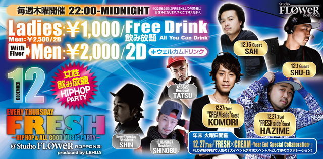 *** メッセージいただければ、お得なディスカウントでご案内します! また、エントランスで「ヒロのゲストのフラワー」と言っていただいても、同様にディスカウントでご案内しますので気軽にご利用ください! *** 12/1(木) 六本木 Studio FLOWERにて、HipHop Party『FRESH』が開催されます!! 今回ゲストDJには... 全世界で爆発的人気を誇るDR.DRE監修によるヘッドフォン〈beats〉の公認 ミックスCDをUNIVERSAL MUSICより世界初リリースしたことでも話題になった 『DJ SHU-G』が登場!! 毎回500人規模で