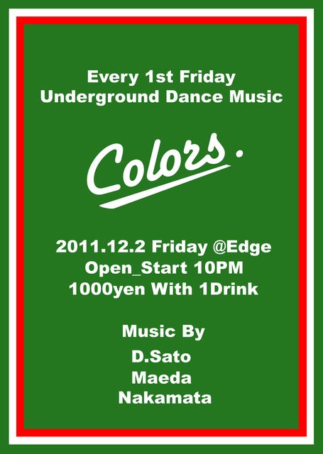 edge 第1金曜のCOLORS.です。 12月もよろしくお願いします! ☆COLORS.☆ 2011.12.2 Friday @Edge ■Open_Start 10PM ■1000Yen With 1Drink ■Music By D.Sato,Maeda,Nakamata □Underground Dance Music http://www.d-colors.jp