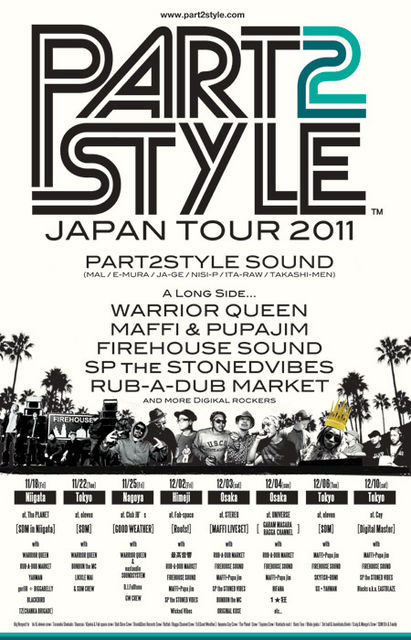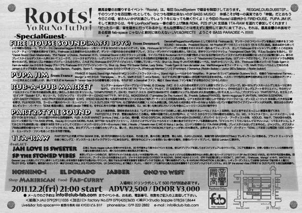 Roots! meets SDM'FIREHOUSE SOUND&PUPAJIM JAPAN TOUR' with 最高音響 12/2(fri) @Live&Bar fab-space (兵庫県:姫路) (公式HP: http://part2style.jugem.jp/?day=20111117 ) (HP: http:// www.clu b-fab.c om/i/in dex.htm l ) (mail: info@club-fab.com ) Start 21:00〜 adv.¥2,500- door.¥3,000- ※入場時にドリンク代として¥500が別途必要です。 ●Special Guest● FIREHOUSE SOUND(MAFFI BOYS/JAHTARI) from Denmark PUPAJIM from France ●Guest● RUB-A-DUB MARKET from Tokyo PART2STYLE(MaL/e-mura/JA-