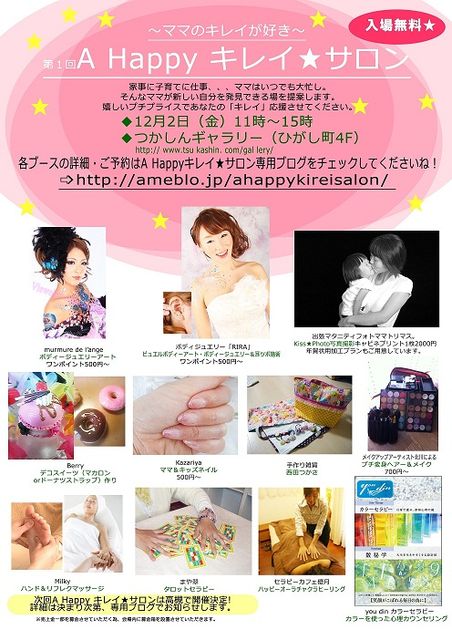 管理人様、貴重なスペースお借り致します。 【第1回 A HAPPY キレイ☆サロン】 家事に子育てにお仕事・・・ママはいつでも大忙し。 そんなママが新しい自分を発見できる場を提案したいと思い、「キレイ」に携わるママが集まりました。 あなたの「キレイ」を応援させてください。 ◇日時:12月2日(金)11〜15時 ◇場所:つかしんギャラリー(ひがし町4F・ユ二クロ近く) 入場無料ですのでお気軽に遊びにきてください! 各ママアーティストの予約必要ブースの予約開始