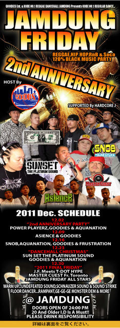 毎週金曜日神戸JAMDUNGにて開催中の"JAMDUNG FRIDAY"(通称:ジャムフラ)が12月で2周年を迎える事になりました。それを祝して12月は豪華ゲスト盛り沢山で今年の年末を突っ走ります。 12月のスケジュールは… 12.02 “2nd ANNIVERSARY PARTY” POWER PLAYERZ,GOODIES & AQUANATION 2周年PARTYとして東京から今注目度NO.1のPOWER PLAYERZを招いてのBIG PARTY!振る舞いシャンパンあり。ジャムフラを朝まで満喫してください! 12.09 この日は女の子は2時まで無料です! ASIENCE & GOODIES レギュラーの2 SOUNDによるJUGGLIN NIGHT。バチ