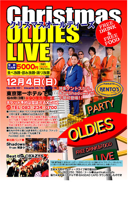 毎年大人気で、定員締め切りとなっています『オールディズ・ライブ・パーティー』が、冬のクリスマス・ライブを開催。 しかも、今回のメインゲスト、2ステージ登場するのは『博多ケントス』の看板バンド『Shadows(シャドウズ)』。もちろん、下関初上陸!。 クリスマスのパーティーにグループなどでお誘い合わせでご利用頂いても結構ですし、恋人同士やご夫婦で何かクリスマスライブに出かけたいという方にも、ハズレのない曲ばかりのオールディーズはぴったり。 『久しぶりに、懐かしの曲で自然に体が動きました』と、往年のオールディ