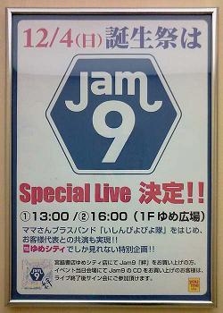 山口県下関市【ゆめシティ誕生祭 Jam9ミニライブ】 日時:2011年12月4日(日)(1)13:00〜/(2)16:00〜 会場:ゆめシティ新下関1Fゆめ広場 大型無料駐車場完備・観覧無料 ママさんブラスバンド「いしんぴよぴよ隊」をはじめ、お客さま代表との共演も実現! 宮脇書店ゆめシティ店にてJam9アルバム「絆」をお買い上げの方、 イベント当日会場にてJam9のCDをお買い上げのお客さまは、 ライブ終了後のサイン会にご参加いただけます。 お近くの方はぜひお越しください! http://www.izumi.co.jp/tenpo/108/event.html http://memb