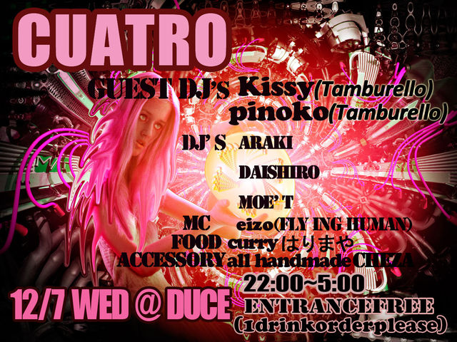 CUATRO LineUP GUEST DJ's Kissy(Tamburello) pinoko(Tamburello) DJ's ARAKI DAISHIRO Moe't MC eizo(FLY ING HUMAN) FOOD curryはりまや ACCESSORY allhandmade CHEZA Infomation 22:00 OPEN/22:00 START ENTRANCE: Entrance Free(1drink order)