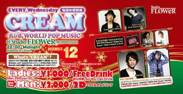 管理人様、告知失礼します。 CREAM @Flower 2011.12.7(WED) 22:00 Open ジャンル : R&B with ALL MIX ゲスト料金詳細 女性 1000円で飲み放題 + シャンパンチケット プレゼント 男性 2000円/2D + ショットガンチケット でご入場頂けます! もはやエントランスフリー状態です ★★★★★★★★★★★★ 代表者名 大体の人数 ★★★★★★★★★★★★ を明記の上、自分まで メッセージをお願いします メッセージのやり取りが 面倒な方は、 エントランスにて ★★★