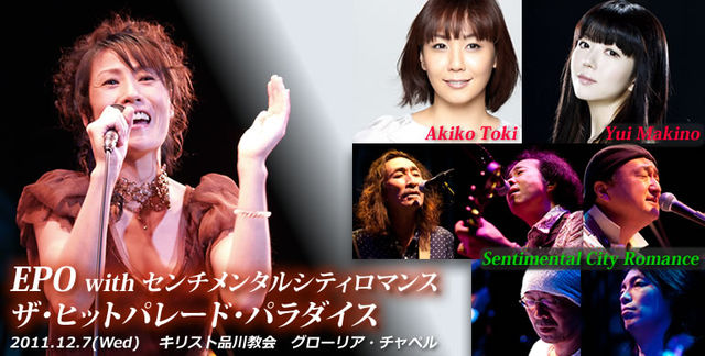 EPO with センチメンタルシティロマンス 「ヒットパレードパラダイス」 12月7日(水) / 19:00 キリスト品川教会 グローリア・チャペル 《出演》EPO/センチメンタルシティロマンス 《ゲスト》土岐麻子/牧野由依 【料金】6,000円(税込) 全席指定 未就学児童膝上無料。お席が必要な場合は有料 +++++++++++++++++++++++++++++++ EPO 30th Anniversary Year 2011は、品川キリスト教会グローリア•チャペルでのポップス満載のコンサートで締めくくります。