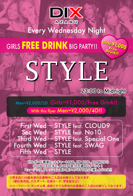 管理人さま告知失礼致します。 本日の新宿axxcisは毎週水曜日と言う事でJ-POP NIGHTの開催です! (J-POP以外もかかります!!) 女性はなんと1000円で終日飲み放題となっております!! ジャンルはJ-POPを基本としたALL MIXスタイル! 店内にはリクエストカードも常設! (時間帯やジャンルにより全てのリクエストには対応できない場合があります) みなさんのご来場お待ちしております! 12/7(WED) J-POP NIGHT OPEN : 23:00〜Midnight ※この日のみ23時OPENとなります。 女性 : ¥1000 / 終日飲み放題 男性 : ¥100