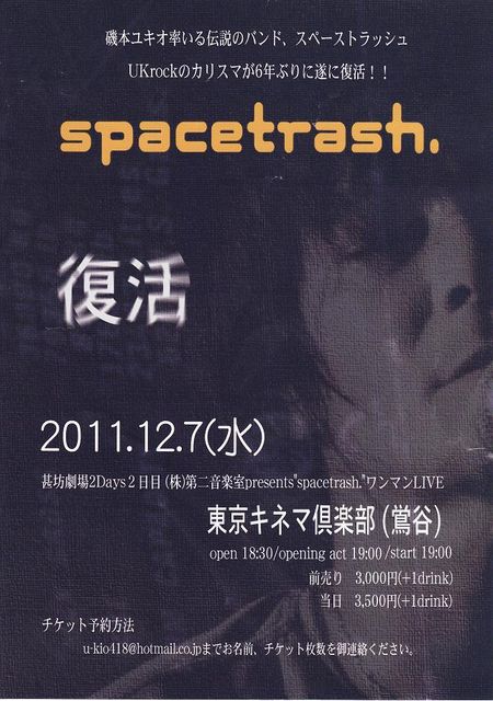 spacetrash. ワンマンライブ!! 6年ぶりの復活ワンマンです! 第二音楽室としても 東京キネマクラブ 2DAYS! 会場 東京キネマ倶楽部 OPEN 18:30 START 19:00 前売り 3000円 当日 3500円 ドリンク別 O.A PULSECREED M.A spacetrash. 主催 第二音楽室 http://www.dainiongakusitu.info 会場 東京キネマ倶楽部 東京都台東区根岸1-1-14 TEL 03-3874-7988