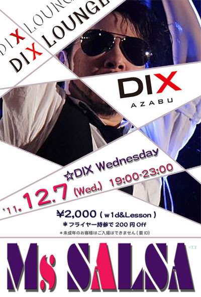 ☆ Ms SALSA★DIX Wednesday☆ http://www.msprojects.org/mssche.html#20111207 ■ 日時:12月7日(水) 19:00〜23:00 ■ 会場:DIX AZABU http://www.dix-lounge.com/ ADDRESS 東京都港区麻布十番1-7-5 フェスタ麻布B2F PHONE 03-6438-9969 ACCESS 大江戸線・南北線 麻布十番駅7番出口徒歩 1分 大江戸線・日比谷線 六本木駅3番出口徒歩 10分 ■ 料金:2,000円 w1d+Lesson *フライヤー(コピー可)持参 200円Off ■ Special SALSA Lesson :Mitsue 19:30-20:10