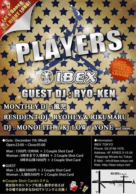 管理人様失礼致します。 毎月第一水曜日は!! 六本木IBEX TOKYOにて、 水曜日にも関わらずHIPHOP好きからMainstream好きのお客様まで楽しむことができるEVENT【PLAYERS】!! 女性は0:30まで入場無料!! ALL DRINKS \500!!! HIPHOP,R&B,REGGAEの旧譜から新譜まで、 完全ALL BLACK MUSICをお届けします!! 都内各地でPLAY経験のあるDJ RYO-KENをGUEST DJに、そして毎月素晴らしいMONTHLY DJをむかえます!! 今月はDJ 風児!! そしてRESIDENT DJには六本木や渋谷を中心に活躍中のDJ RYOHEY & RIKUMARUを中心に、 注目の若手DJ陣がFLOORを朝ま
