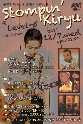 告知失礼させていただきます。 SLY MONGOOSEの超絶ギタリスト塚本功。 元東京スカパラダイスオーケストラのリーダーであり ASA-CHANG&巡礼などでも活動中のASA-CANG。 ピラニアンズの長山の3人が『塚本功TORIO』として桐生LEVEL5に初登場! パーカショニストとして有名なASA-CHANG。ドラムも必見です。 塚本功TORIO ASA-CHANG LEVEL-5 12th anniversary vol.2『Stompin' Kiryu』 GUEST LIVE :塚本功 TORIO【塚本功×ASA-CHANG×長山雄治】 □ DJ: K. 清水健一. Mahgary.YUTTA. 関口拓也. 斉藤孝 □ BAND:塚本功 TOR